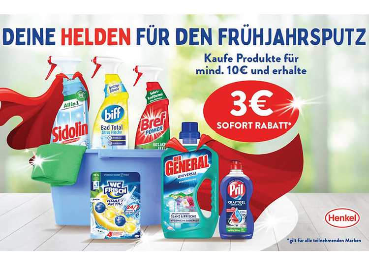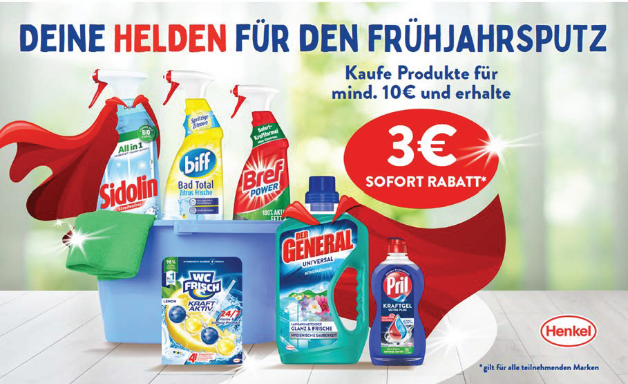 In diesem Frühling ist es wieder soweit: Vom 2. März bis 19. April 2026 können Verbraucher:innen beim Kauf von Henkel Produkten bares Geld sparen und gleichzeitig ihr Zuhause frühlingsfrisch zaubern. Beim Kauf teilnehmender Henkel-Produkte im Wert von 10 Euro erhalten Kunden:innen einen Sofort-Rabatt von 3 Euro!1