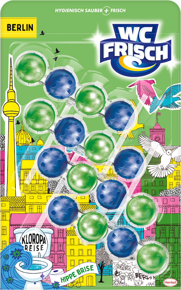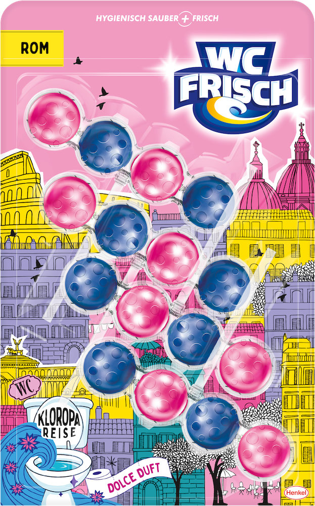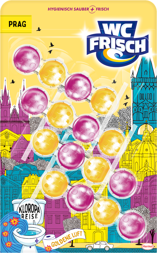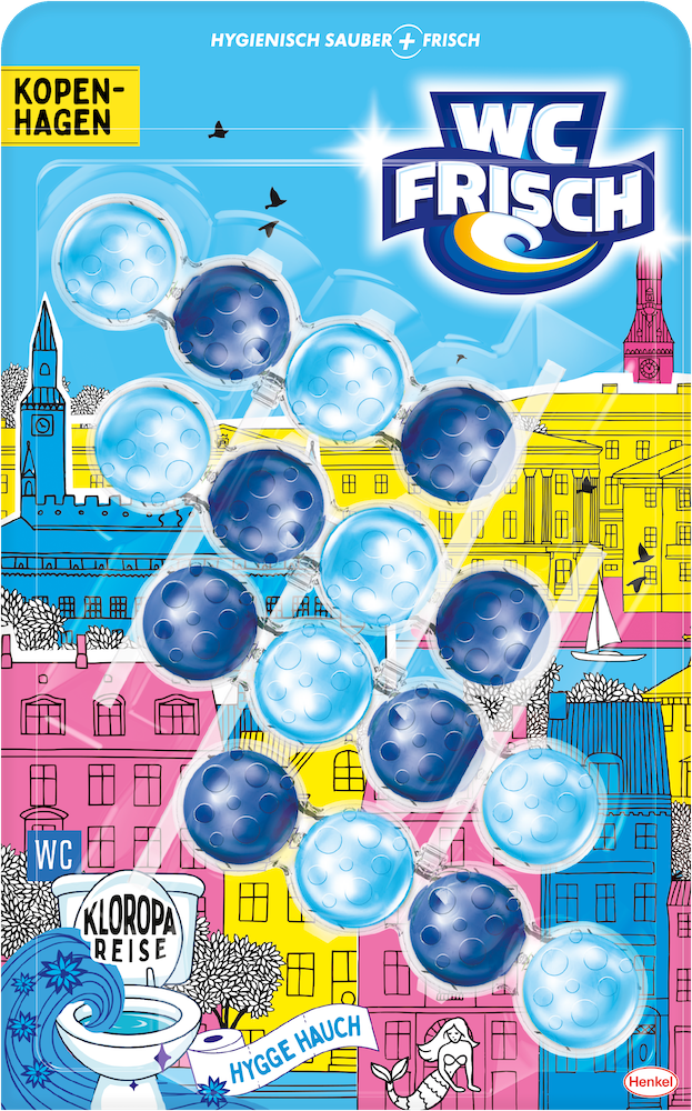 Die Varianten Berlin: Hippe Brise, Rom: Dolce Duft, Kopenhagen: Hygge Hauch und Prag: Goldene Luft sorgen für langanhaltende Frische, hygienische Sauberkeit und ein besonderes Dufterlebnis – ganz ohne Reisestress. Alle WC-Spüler der neuen WC FRISCH Edition sorgen dank der bewährten Reinigungskraft mit der 4-fach-Aktivstoff-Kombination für ein sauberes und glänzendes WC. Der Reinigungsschaum reinigt die Toilette intensiv, während die Anti-Kalk-Formel Kalkablagerungen entgegenwirkt. Der Schmutz-Protektor schützt zusätzlich davor, dass neuer Schmutz wieder anhaftet. Gleichzeitig sorgen die Kugeln für einen intensiven Duft – für eine langanhaltende Frische bis zu 250 Spülungen.